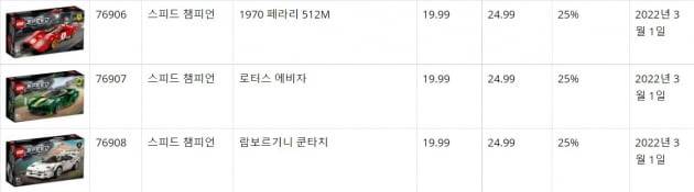 자동차 모형의 레고 ‘포르쉐911’과 ‘애스턴 마틴’ 제품은 오는 8월 25%씩 가격이 올라 각각 169.99유로(22만4000원)와 24.99유로(3만3000원)에 책정됐다. 또 다른 인기 모델인 ‘닌자고 시티 정원’은 299.99유로(40만3000원)에서 17% 상승한 349.99유로(47만3000원)에 판매될 예정이다. 완구업계 관계자는 “환율과 운송비 등을 고려해 국내 제품 가격이 해외보다 높은 전례를 봤을 때 최대 30%까지 인상될 가능성이 있다”고 말했다.