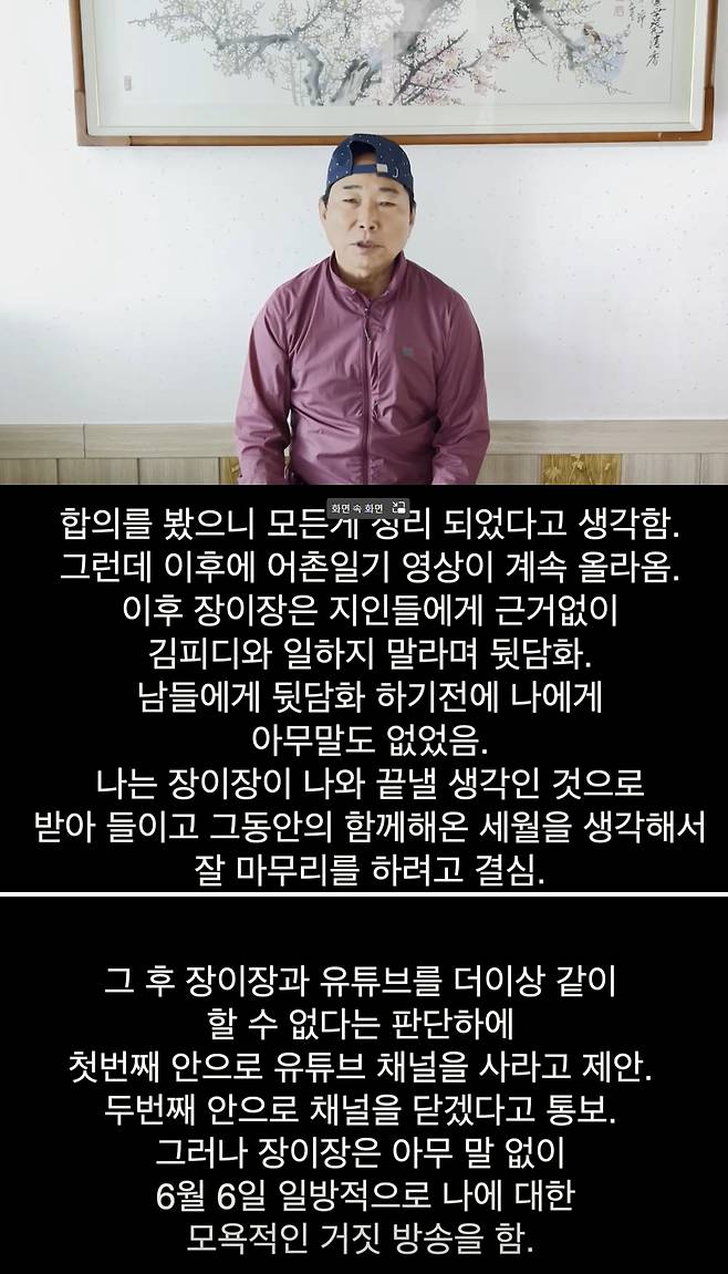 이어 김 피디는 '장 씨가 상의 한 마디 없이 '어촌일기'를 제작했다고 일방적으로 통보했다. 의논 없이 일방적으로 어촌일기 영상이 올라왔다. 장 씨와의 신뢰가 모두 무너졌다. 토사구팽 당했다'며 '원만하게 합의하려고 했지만 계속 '어촌일기' 영상이 올라왔고 정신적 충격으로 '그까이꺼'의 영상을 모두 닫았다'고 강조했다.