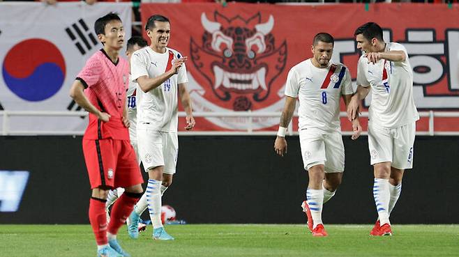 10일 오후 수원월드컵경기장에서 열린 남자 축구 국가대표팀 평가전 대한민국 대 파라과이의 경기, 미구엘 알미론의 선취골에 파라과이 선수들이 기뻐하고 있다.