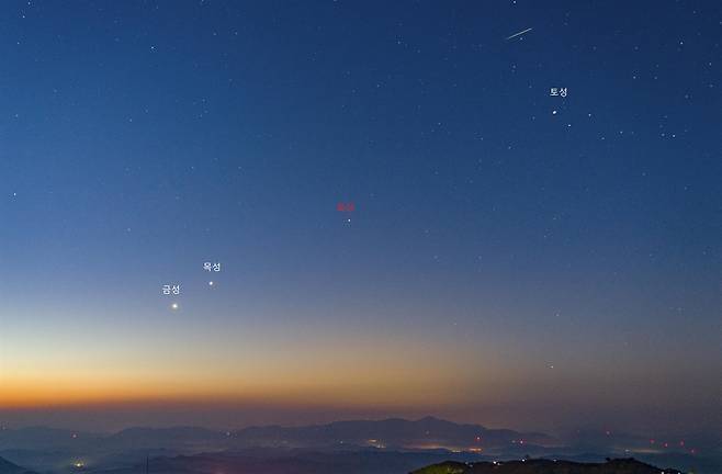 | ▲ 5월 5일 새벽녘 동쪽 하늘의 4대 행성 금성, 목성, 화성, 토성의 배열로 일직선을 이루고 있으나, 행성들의 이동 속도가 다르기 때문에, 6월 중순에는 수성, 금성, 화성, 목성, 토성의 배열로 바뀐다. |
