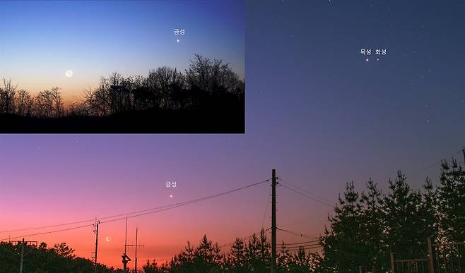 | ▲ 5월 28일 새벽녁 동쪽 하늘의 행성들(작은 사진은 2016년 2월 7일 새벽하늘) 한 하늘에서 월수금화목토성을 한꺼번에 볼 수 있다는 것 자체가 행운이다. 한달 후 화성은 목성을 지나쳐 금성과 목성 사이에 위치하게 되고, 그믐달과 금성 사이에 수성이 나타난다. |