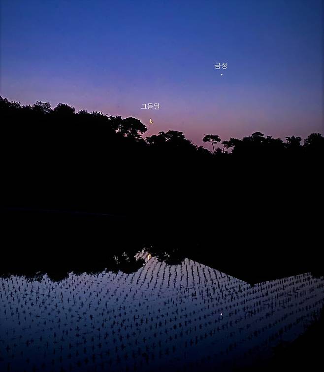 | ▲ 스마트폰으로 촬영한 그믐달과 금성의 모습 5월 28일 새벽녘 동쪽 하늘의 그믐달과 금성이 모내기를 방금 한 논물에 비춰진 모습. 스마트폰 하나로 티코 브라헤보다 더 정확하게 행성의 움직임을 기록할 수 있는 시대가 되었다. |