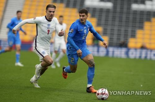 epa10008832 Giovanni Di Lorenzo of Italy (R) is challenged by Jack Grealish of England during the UEFA Nations League soccer match between England and Italy in Wolverhampton, Britain, 11, June 2022. EPA/ANDREW YATES