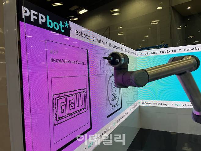 전시장 한켠에는 블록체인 인프라 운영사 체인이 마련한 프로필 사진을 그리는 ‘PFP(프로필 사진) 봇’을 보기 위해 사람들이 몰려들었다. 전기 소모가 적다며 ‘친환경 코인’을 내세워온 카르다노는 부스를 실제 식물로 꾸몄다.