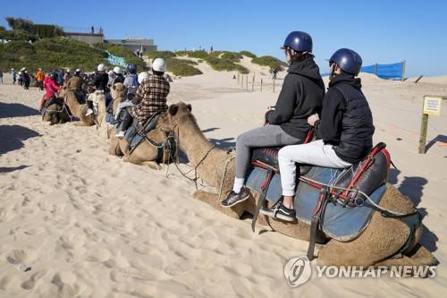 Tourists wait to ride camels at Birubi Point in Anna Bay, Australia, Sunday, June 12, 2022. (AP Photo/Mark Baker)