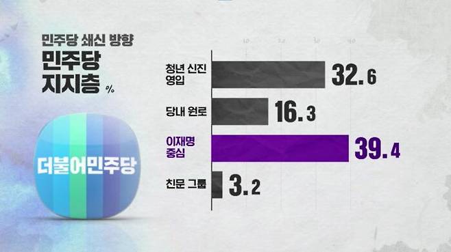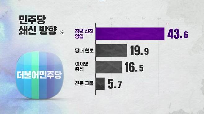 청년 신진 인재 영입을 통한 세대 교체가 43.6%로 첫 손에 꼽혔고, 다음으로 당내 원로 인사를 통한 세력 통합, 이재명 의원을 중심으로 한 재편, 친문 그룹 중심 재편 순이었습니다.