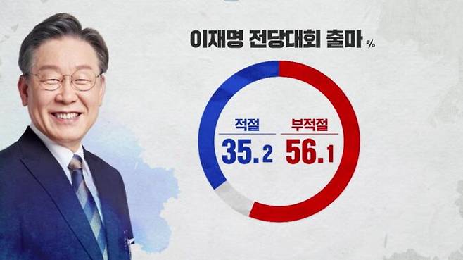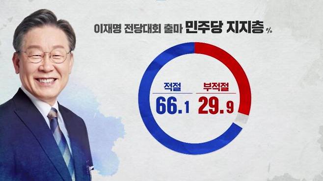 오는 8월 이재명 의원의 민주당 당권 도전에 대해서는 적절하다 35.2%, 부적절하다 56.1%였는데, 민주당 지지층에서는 적절하다 66.1%, 부적절하다 29.9%로 정반대였습니다.