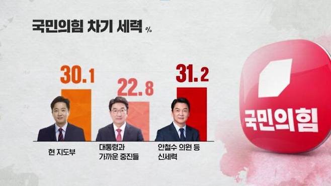 국민의힘을 이끌어갈 차기 리더십으로는 안철수 의원을 포함한 새로운 세력 31.2%, 이준석 대표를 비롯한 현 지도부 30.1%로 오차 범위 내에서 비슷했고, 윤석열 대통령과 가까운 중진들이라는 답이 22.8%로 뒤를 이었습니다.