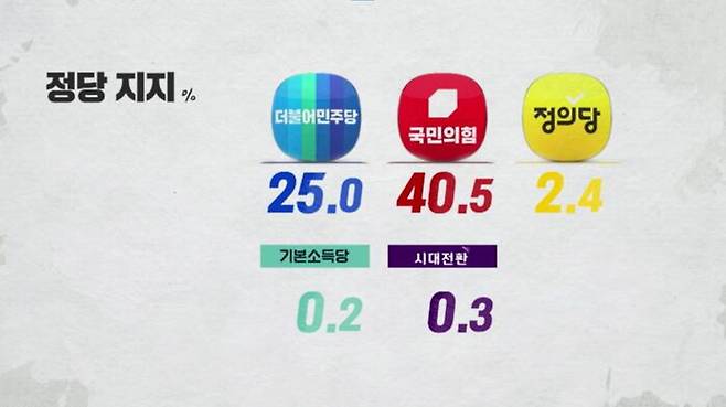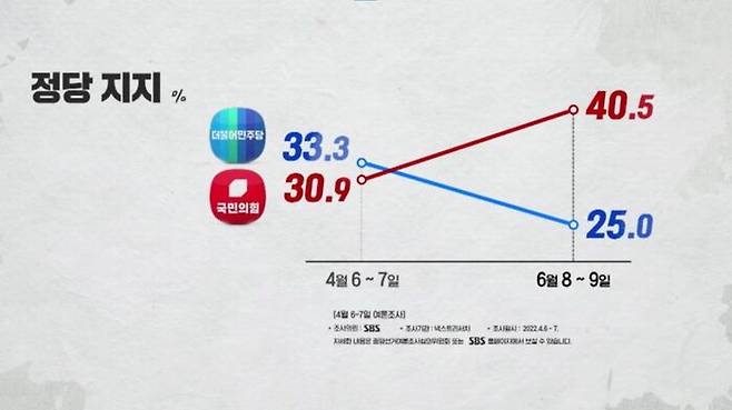 정당 지지도는 국민의힘 40.5%, 민주당 25%, 정의당 2.4%였는데, 두 달 전에 비해 국민의힘은 9.6%포인트 상승, 민주당은 8.3%포인트 하락했습니다.