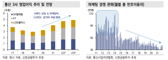 12일 신한금융투자에 따르면 올해 3사(SK텔레콤, KT, LG유플러스)의 영업이익을 4조7200억원으로 지난해 같은 기간보다 17% 성장할 것으로 기대된다. LTE 전환기인 2012년 하반기부터 2014년 하반기 통신 3사의 시가총액은 79.7% 증가했는데, 올해는 5G 가입자가 증가하면서 같은 상황이 연출될 것으로 기대된다.