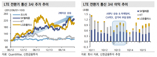 LTE 전환기인 2012년 하반기부터 2014년 하반기 통신 3사의 시가총액은 79.7% 증가했는데, 올해는 5G 가입자가 증가하면서 같은 상황이 연출될 것으로 기대된다.