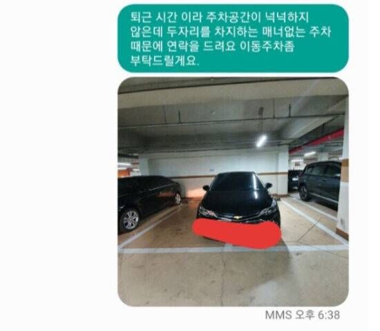 A 씨는 해당 차량에 남겨진 전화번호로 "퇴근 시간이라 주차 공간이 넉넉하지 않은데, 두 자리를 차지하는 매너 없는 주차 때문에 연락을 드린다. 이동 주차 부탁드린다"고 문자메시지를 보냈습니다.