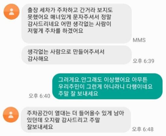 이에 B 씨는 "주차 공간이 차 10대는 더 들어올 수 있을 만큼 남아 있던데 오지랖 감사드린다. 주말 잘 보내시라"라고 끝까지 비꼬는 내용의 문자를 보냈습니다.