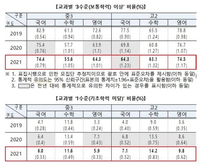 중3 국어·수학, 고2 영어도 보통학력 이상 학생 비율이 각 1.0∼2.2%포인트 안팎 감소했지만, 교육부는 통계적으로 유의한 수준은 아니라고 설명했다.