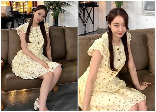 경리는 귀여운 패턴이 들어간 원피스를 입고 사진을 찍었다.