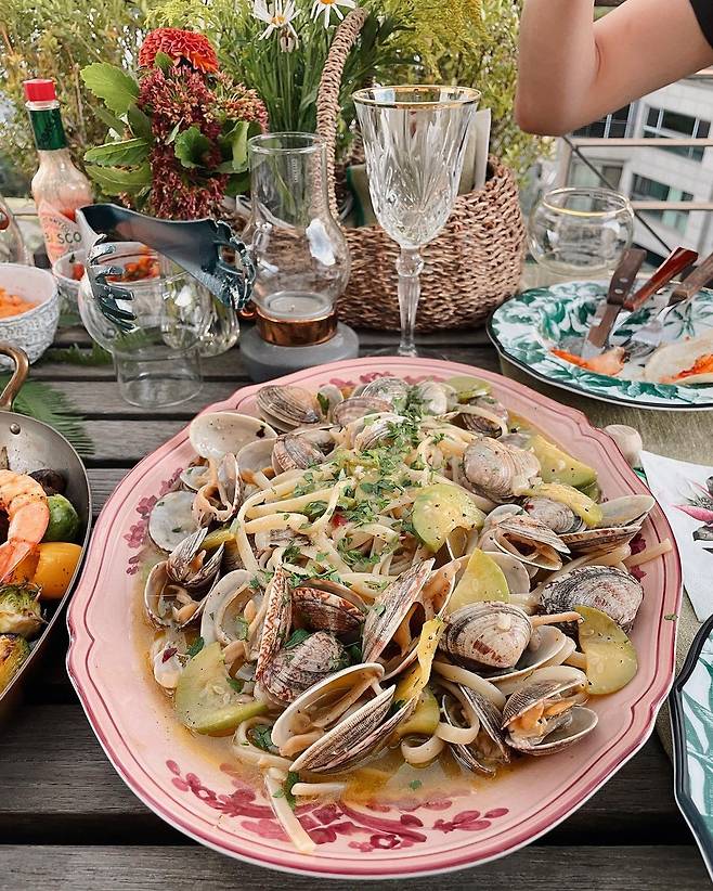 사진 속 기은세와 한지혜, 전혜빈, 전인화는 먹음직스러운 음식들을 앞에 두고 화기애애한 분위기를 자랑하고 있다. 옥상에서 럭셔리한 저녁을 즐기고 있다.