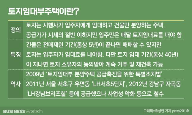 서울에서는 이명박 정부때 서초구 'LH서초5단지'(2011년 공급)와 강남구 'LH강남브리즈힐'(2012년 공급) 등 2곳이 토지임대부주택으로 공급됐다.