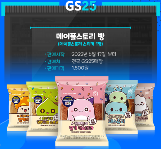 출시되는 빵은 ▲주황버섯의 폭신달콤 팬케이크 ▲슬라임의 부드러운 땅콩크림 소보로 ▲핑크빈의 상큼달콤 딸기 카스테라 ▲돌의 정령의 달콤초코 페스츄리 ▲예티의 폭신폭신 메이플 크림샌드로 총 5가지이며, 빵 안에는 80종의 메이플스토리 스티커 중 1장이 포함돼 있다.