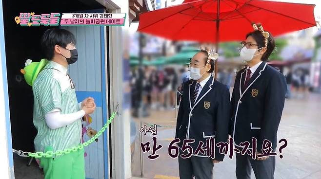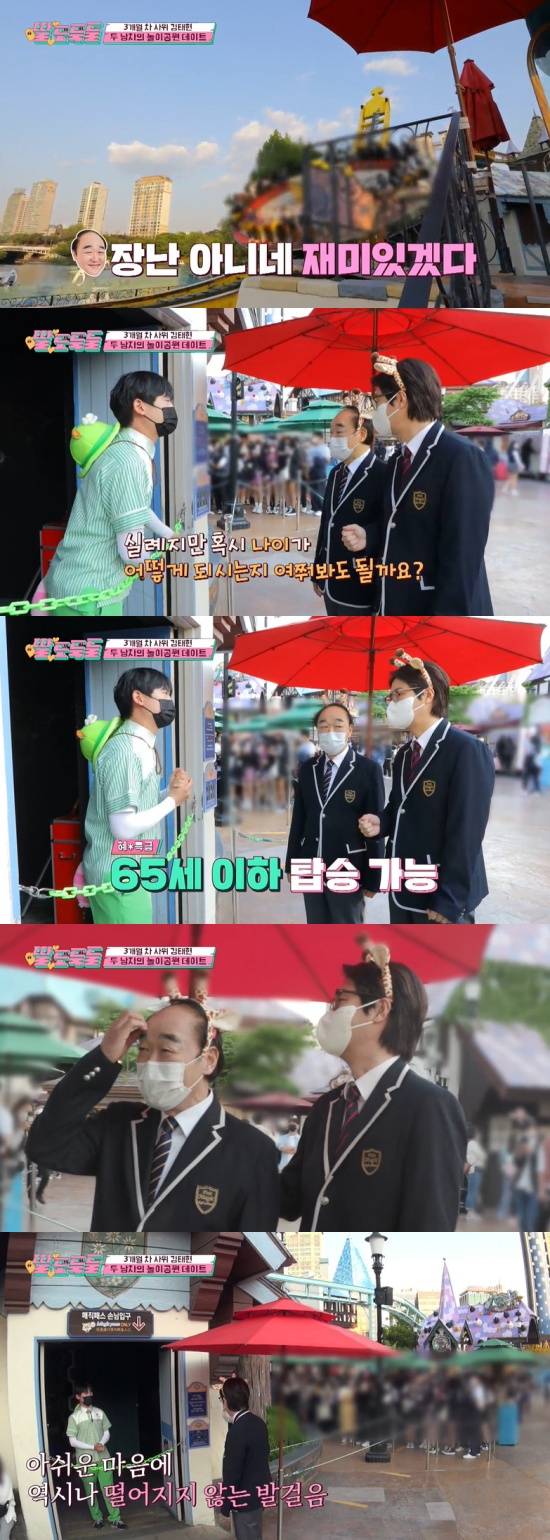 교복을 입고 놀이공원에 등장한 두 사람은 동심으로 돌아간 것 같은 모습을 보였다. 장광은 김태현과 귀여운 머리띠까지 쓰며 설렘을 감추지 않았다. 아이템 쇼핑부터 회전목마 탑승까지 이어나간 장광은 나이 제한이 있는 놀이기구 앞에서는 시무룩한 표정을 지었다.