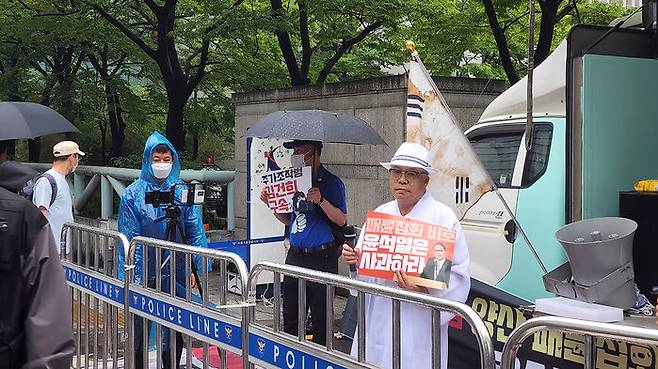 비가 내리는 가운데 열린 오늘 집회에는 서울의소리 측 관계자 등 5명이 참가했습니다.