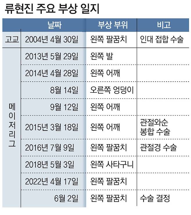 류현진이 수술대에 오르는 건 이번이 네 번째다. 동산고 2학년이던 2004년 4월 한 차례 토미 존 수술을 받았고, LA 다저스 소속이던 2015년 5월에는 왼쪽 어깨 관절와순 봉합 수술을 받았다. 2016년 9월에도 괴사한 왼쪽 팔꿈치 조직을 제거했다. 류현진은 그때마다 보란 듯이 재기했다.