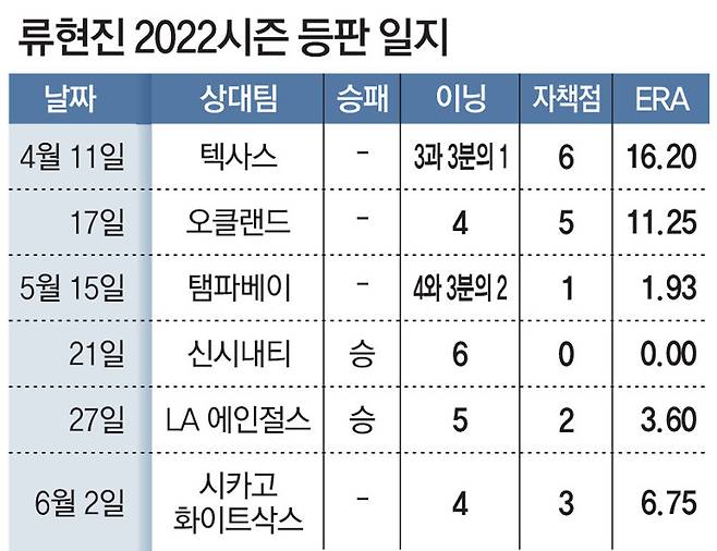 류현진은 이번 시즌 6경기에 선발 등판해 2승 평균자책점 5.67을 남겼다. 이달 2일 시카고 화이트삭스전이 마지막 경기였다. 이날 4이닝 3실점을 기록한 뒤 마운드에서 내려온 류현진은 왼쪽 팔뚝 염증으로 MLB 데뷔 이후 13번째로 부상자 명단(IL)에 이름을 올렸다. 경기 후 류현진은 “오늘 등판을 후회한다”며 아쉬움을 드러냈다.