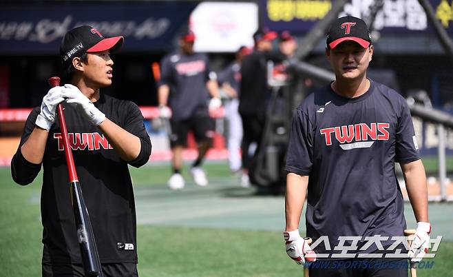 2022 KBO리그 LG 트윈스와 삼성 라이온즈의 경기가 16일 잠실구장에서 열린다. LG 송찬의, 손호영이 훈련을 하고 있다. 잠실=박재만 기자 pjm@sportschosun.com/2022.06.16/