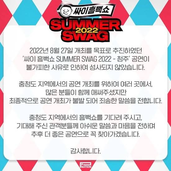 싸이는 16일 개인 SNS를 통해 오는 8월 27일 개최 예정이었던 '싸이 흠뻑쇼 SUMMER SWAG 2022 - 청주' 공연이 성사되지 않았음을 알렸다.