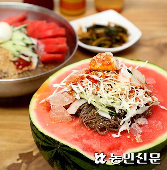 여름 과일의 제왕 수박과 무더위를 잠재워줄 냉면이 어울림음을 내는 곳이 있다. 인천시 동구 화평동 냉면거리 들머리에 있는 ‘일미 화평동 냉면’ 식당에 가면 입이 딱 벌어질 만한 광경이 펼쳐진다. 메뉴판에 적힌 ‘수박냉면’을 주문해보자. 그럼 지름 20㎝는 족히 넘을 만한 수박 반통에 면과 얼음 육수가 단아하게 담겨 나온다.
