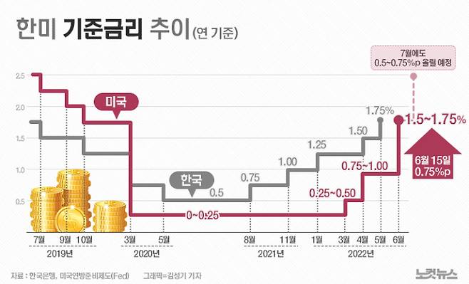 더구나 미국 기준금리가 오른만큼 한국 역시 금리 인상 압력에 직면하고 있다. 코로나19 사태로 풀려나간 유동성 문제를 해결하기 위해서라도 금리 인상은 피할 수 없는 상황이다. 이미 한국은행은 지난해 8월부터 전달까지 다섯 차례에 걸쳐 0.25%p씩 기준금리을 올렸지만, 고물가·고환율 기조가 이어지면서 추가 금리 인상이 불가피한 상황이다.