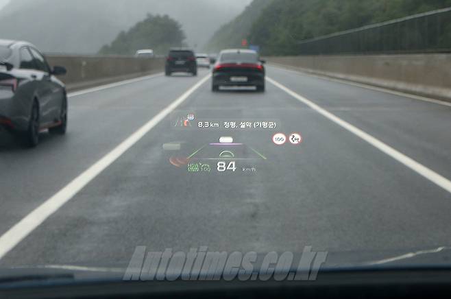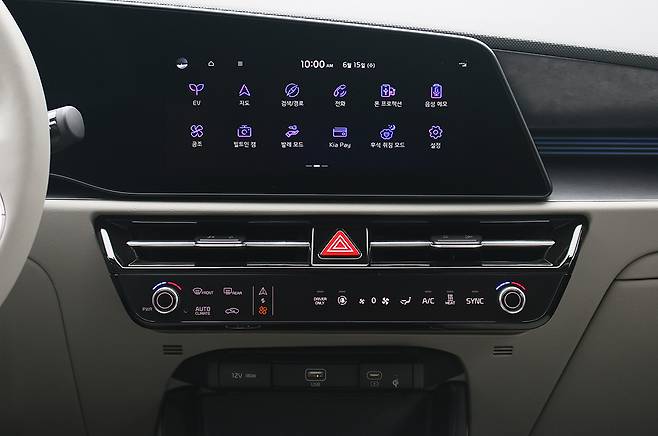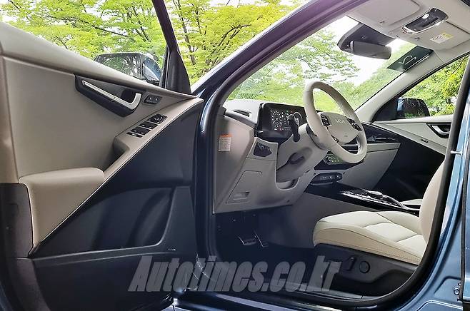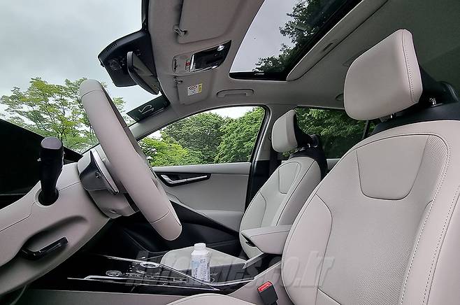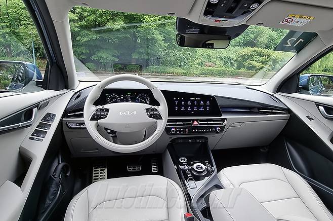 실내는 과감한 곡선을 중심으로 섬세함을 강조한 대시보드와 도어트림이 시선을 사로잡는다. 담백한 디자인의 2-스포크 스티어링 휠은 적절한 직경과 편리한 버튼 배치가 이뤄졌다. 디지털 계기판과 인포테인먼트 모니터는 하나의 패널로 묶었다. AVN 모드와 에어컨 모드를 따로 표시하는 조작 패널은 간결한 센터페시아를 만드는 핵심 품목이다. 헤드업 디스플레이는 면적이 크지 않지만 주행 및 제한 속도, 내비게이션, 운전자보조시스템 작동 여부, 후측방 경고 등 계기판 못지않게 많은 정보를 표시한다. 도어 트림과 클래시 패드 등에 적용한 알루미늄 효과 트림은 낯선 분위기를 연출한다.
