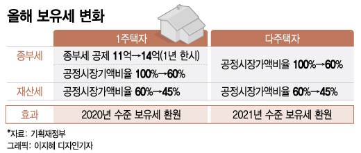 이와 동시에 재산세 공정시장가액비율이 현행 60%에서 45%로 낮아지고, 종부세는 100%에서 60%로 떨어진다. 1주택자 세부담은 이런 식으로 2020년 수준으로 환원되는 것이다.