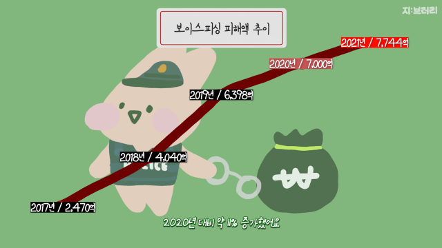 이처럼 최근의 보이스피싱 수법들은 디지털 기술을 활용해 새로운 형태로 나타나고 있고 그 피해가 더욱 커지고 있다. 실제로 경찰청의 2021년 보이스피싱 현황에 따르면 지난해 보이스피싱 사기 피해액은 총 7,744억 원으로 전년 (7,000억원) 대비 약 11% 증가했다. 보이스피싱 피해를 최소화하기 위해 개인은 진화하는 신종 보이스피싱 수법들을 인지하고 적극적으로 경계할 필요가 있다. 특히 금융감독원에서 운영하는 ‘보이스피싱 지킴이’ 누리집을 수시로 확인하는 것이 도움이 될 수 있다. 이를 통해 보이스피싱 사례와 실제 범죄자들의 목소리를 확인할 수 있고 피싱 피해 시 도움이 되는 주요 연락처 등을 알 수 있다.