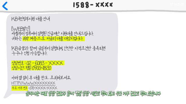 어느 날, 피해자에게 문자 한 통이 도착한다. 코로나19로 어려움을 겪는 취약 계층에게 저금리의 대출을 지원하고 있으니 무료로 대출 한도를 조회해보라는 문자다. 문자에는 대표 상담 번호와 함께 평일 상담 시간도 적혀 있고, 무료 거부 번호도 적혀 있다. 실제로 상담 시간 외에 전화를 걸면 여느 기업처럼 “현재는 상담 시간이 아니라 상담이 불가하다”는 안내 음성까지 나온다. 피해자는 무료로 대출 한도를 조회해보기 위해 링크를 클릭한다. 그 순간 핸드폰엔 악성 어플이 깔린다. 악성 어플의 UI는 실제 금융기관의 그것과 유사하기 때문에 어플을 실행시킨 피해자는 본인이 보이스피싱의 덫에 걸렸다는 사실을 인지하기 어렵다.