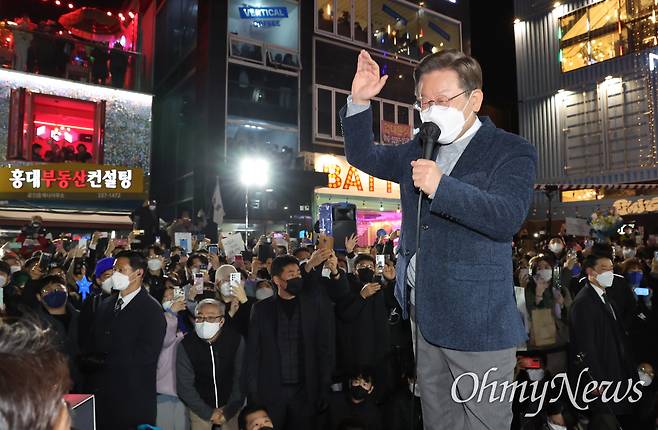 | ▲ 이재명 더불어민주당 대선후보가 지난 3월 8일 서울시 마포구 홍대 걷고싶은거리 광장무대에서 마지막 유세를 하고 있다. |