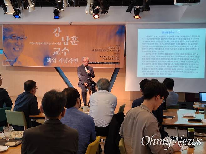 | ▲ 이재명 더불어민주당 의원의 '기본소득 스승'으로 불리는 강남훈 한신대(경제학, 전 기본소득한국네트워크 이사장) 교수가 16일 오후 서울 청년문화공간 JU동교동 1층 카페에서 퇴임 기념강연을 했다. |
