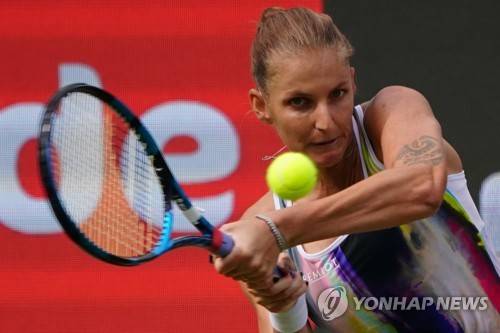 epa10018373 Karolina Pliskova of the Czech Republic in action during her quarter final match against Cori Gauff of the USA at the WTA German Open tennis tournament in Berlin, Germany, 17 June 2022. EPA/CLEMENS BILAN