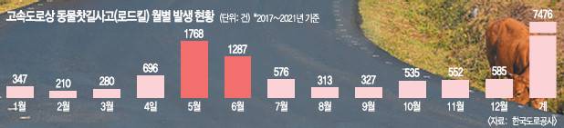 야생동물 활동량이 증가하는 여름철이 되면서 세종시뿐 아니라 전국 각지에서 로드킬 사고가 늘고 있다. 특히 5~6월은 로드킬 사고가 가장 빈발하는 시기다. 한국도로공사에 따르면 최근 5년간 고속도로에서 발생한 로드킬 사고 7476건 가운데 5~6월에 3055건이 발생해 41%에 달한다.