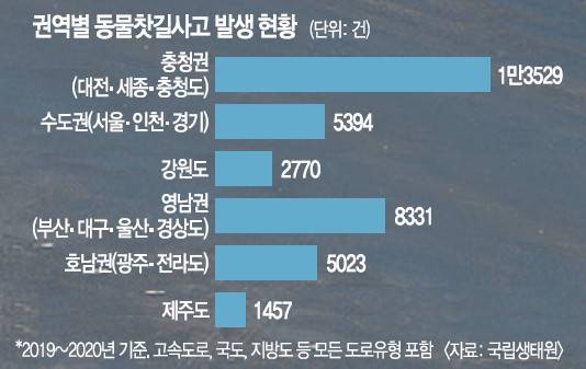 로드킬은 주로 충청도 지역에서 많이 발생한다. 국립생태원 로드킬정보시스템에 따르면 2020년 기준 충청권(충청도와 대전·세종 포함) 로드킬 발생 건수는 총 4850건으로 1370건인 강원도보다 3.5배 많다. 영남권(3374건)보다도 30% 많다. 이와 관련해 송 연구원은 “충청도에 농경지, 초지, 습지 등 로드킬 빈도가 높은 동물 서식지가 많고, 서식지 인근에 도로도 많이 나 있는 편”이라고 설명했다.