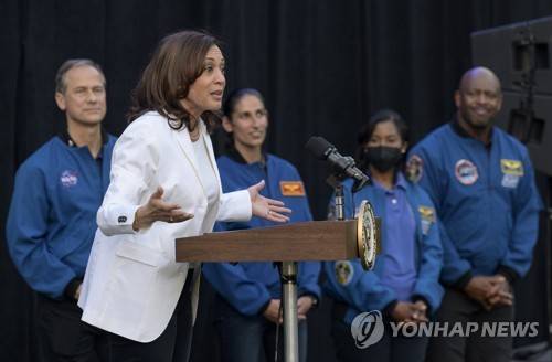 epa10019428 A handout photo provided by the National Aeronautics and Space Administration (NASA), shows US Vice President Kamala Harris giving remarks as NASA astronauts (L-R) Tom Marshburn, Jasmin Moghbeli, Stephanie Wilson, and Former NASA astronaut Leland Melvin, look on, on the grounds of the Vice President's residence at the Naval Observatory, in Washington, DC, USA 17 June 2022. Harris and the Second Gentleman hosted an evening of NASA STEM activities for military families and local STEM students and their families, including a special screening of Disney Pixar?s Lightyear. EPA/Bill Ingalls / HANDOUT HANDOUT EDITORIAL USE ONLY/NO SALES