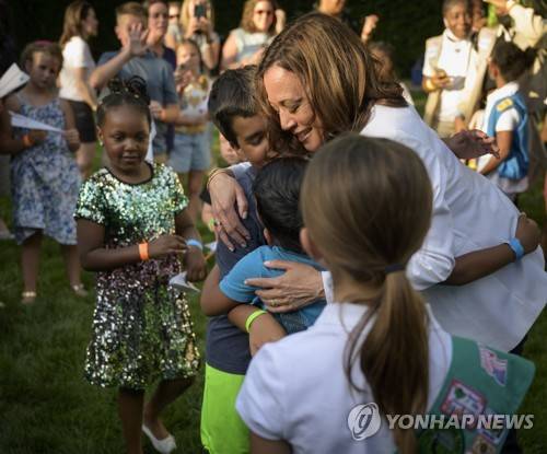 epa10019425 A handout photo provided by the National Aeronautics and Space Administration (NASA), shows US Vice President Kamala Harris hugging children that participated in hands-on STEM activities, on the grounds of the Vice President's residence at the Naval Observatory, in Washington, DC, USA 17 June 2022. Harris and the Second Gentleman hosted an evening of NASA STEM activities for military families and local STEM students and their families, including a special screening of Disney Pixar?s Lightyear. EPA/Bill Ingalls / HANDOUT HANDOUT EDITORIAL USE ONLY/NO SALES