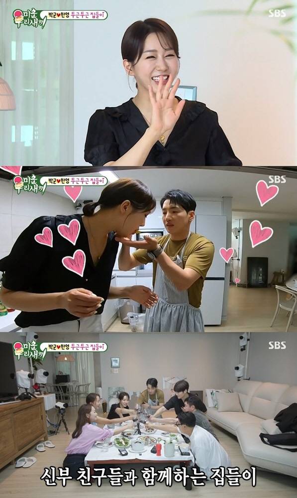 한영은 이들을 위한 집들이 음식을 준비하는 도중 남편 박군과 러블리한 케미를 선보이며 시청자를 웃음 짓게 한 것은 물론, 미모의 친구들까지 집에 초청해 두근두근한 분위기로 반전시켰다.