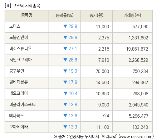 [fnRASSI]장마감, 코스닥 하락 종목(노터스 -29.9% ↓)
