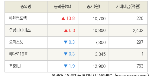 특히 이원컴포텍은 전 거래일 대비 13.8% 오른 10,700원에 거래를 마감하여 높은 관심을 받았다.
