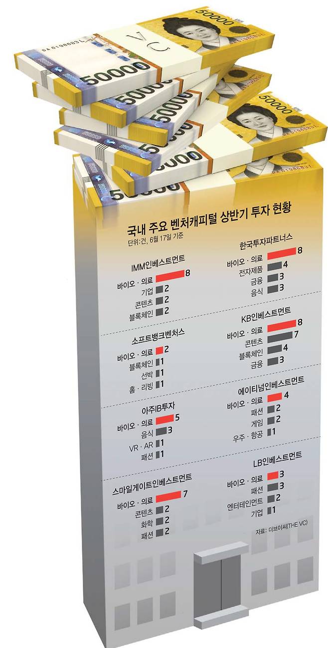 국내 주요 벤처캐피털(VC)들이 올해 상반기 바이오·의료 분야에 집중 투자한 것으로 나타났다. 깐깐해진 상장 심사에 증시 부진까지 겹치면서, 기업공개(IPO) 시장에서 바이오 기업이 고전을 면치 못하는 것과 대조적이다. 밸류에이션 리레이팅(가치 재평가)으로 바이오 스타트업 가치가 떨어지면서 오히려 후속 투자 유인이 커진 데다, 유망산업이라는 점은 변함없다는 게 반영됐다는 분석이다.