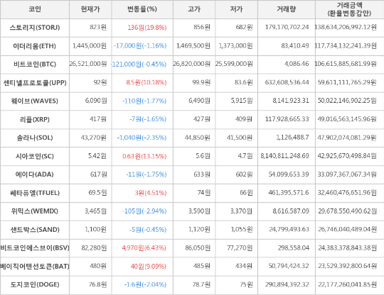 가상화폐 비트코인 -0.45% 하락, 스토리지 19.8% 상승