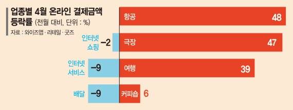거리두기 해제가 적용된 4월 배달업종 온라인 거래액은 전월 대비 9% 감소했다. 같은 기간 여행(39%), 커피숍(6%) 등 업종에선 거래액이 급증한 것과 비교되는 대목이다.