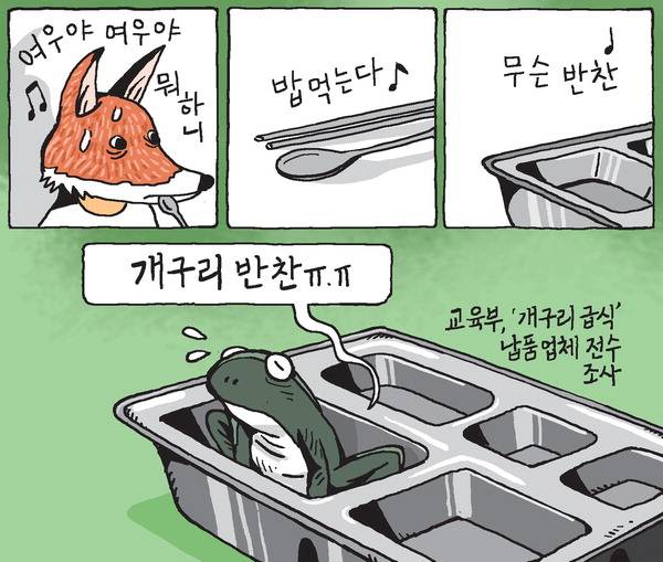 [서상균 그림창] 개구리 반찬ㅠ.ㅠ 서상균 기자 2022. 6. 21. 03:03 음성으로 듣기 음성재생 설정 이동 통신망에서 음성 재생 시 데이터 요금이 발생할 수 있습니다. 글자 수 10,000자 초과 시 일부만 음성으로 제공합니다. 남성 여성 느림 보통 빠름 음성 재생하기 닫기 음성 재생 중지 번역 설정 번역beta Translated by kaka i 한국어 - English 영어 日本語 일본어 简体中文 중국어 Nederlands 네델란드어 Deutsch 독일어 Русский 러시아어 Malaysia 말레이시아어 বাঙ্গোল ভাষা 벵골어 tiếng Việt 베트남어 Español 스페인어 اللغة العربية 아랍어 Italiano 이탈리아어 bahasa Indonesia 인도네시아어 ภาษาไทย 태국어 Türkçe 튀르키에어 Português 포르투갈어 Français 프랑스어 हिन्दी 힌디어 닫기 번역중 Now in translation 글씨크기 조절하기 글자크기 설정 파란원을 좌우로 움직이시면 글자크기가 변경 됩니다. 가 매우 작은 폰트 작은 폰트 보통 폰트 큰 폰트 매우 큰 폰트 가 이 글자크기로 변경됩니다. (예시) 가장 빠른 뉴스가 있고 다양한 정보, 쌍방향 소통이 숨쉬는 다음뉴스를 만나보세요. 다음뉴스는 국내외 주요이슈와 실시간 속보, 문화생활 및 다양한 분야의 뉴스를 입체적으로 전달하고 있습니다. 닫기 인쇄하기 seoseo@kookje.co.kr Copyright © 국제신문. 무단전재 및 재배포 금지.