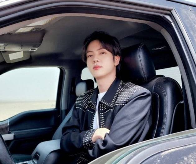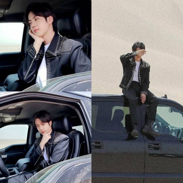 검은 트럭과 잘 어울리는 라이더 재킷 느낌의 가죽 재킷을 입은 진은 팔짱을 낀 채 정면을 바라보는데 작은 얼굴에 도자기 같은 피부, 남자답게 시원한 눈썹과 쭉뻗은 날렵한 콧대가 더해지며 멋진 모습으로 광활한 사막을 멋진 오아시스로 만들어 역시 비주얼킹 임을 다시 한번 상기시켰다.