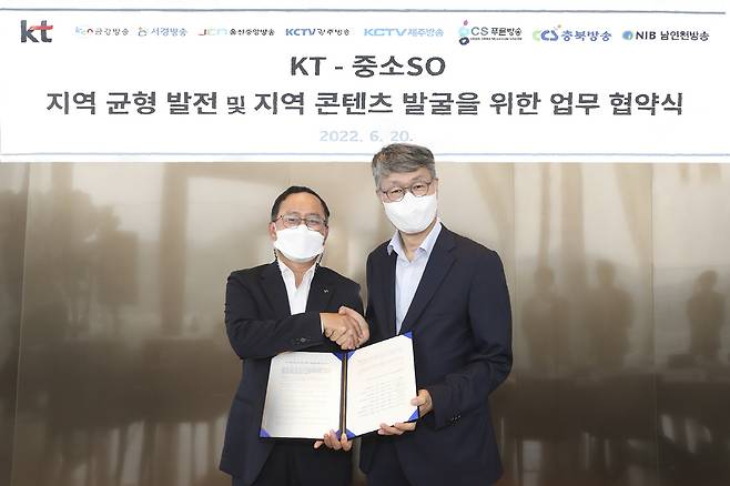 KT는 지역중소종합유선방송사업자(이하 '중소SO')와 서울시 종로구에 위치한 KT 광화문 빌딩 East 사옥에서 지역 균형 발전 및 지역 콘텐츠 발굴을 위한 업무 협약을 체결했다고 21일 밝혔다.
